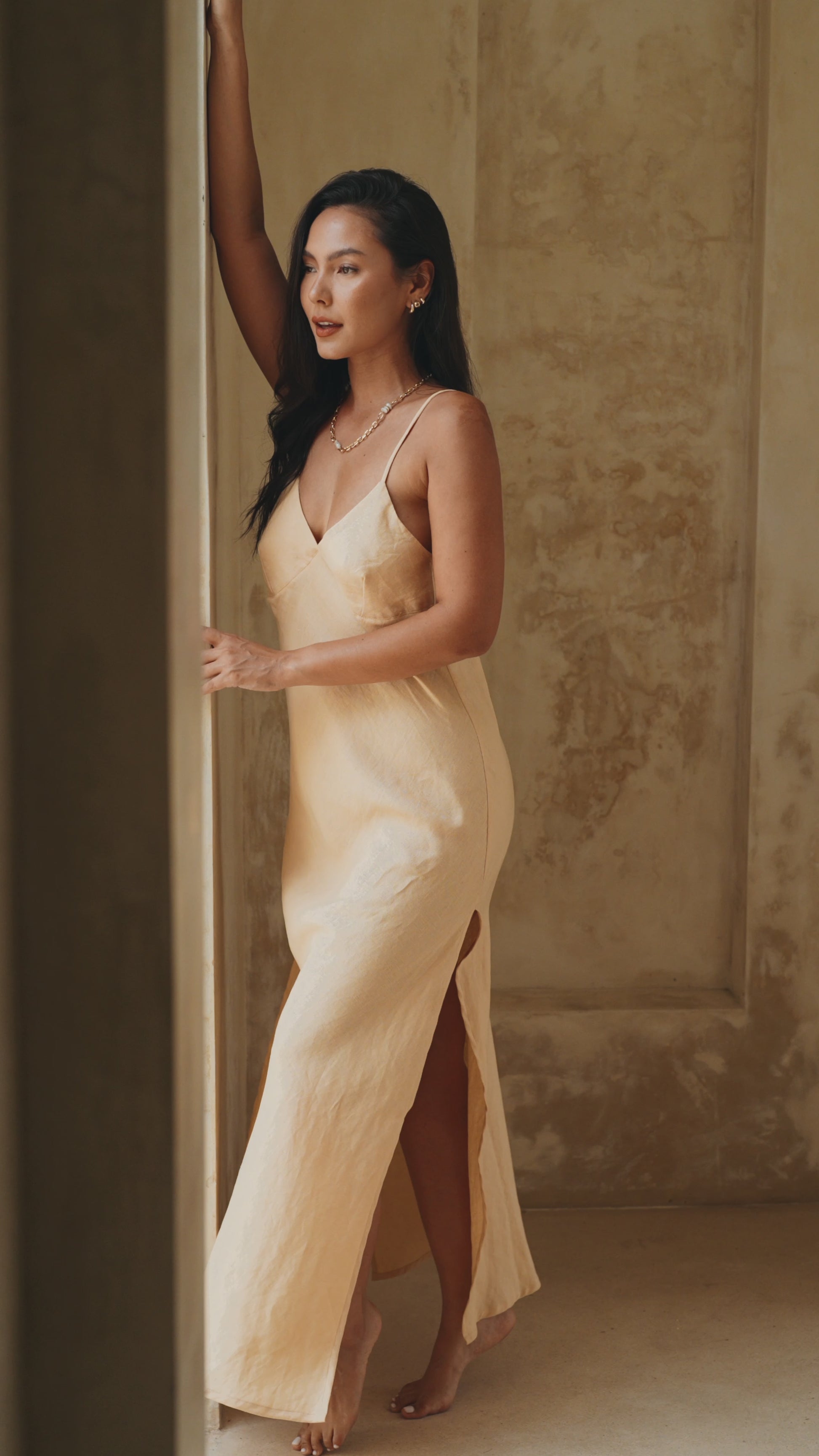 Introducing the Hera Maxi Dress in Muted Peach – the embodiment of timeless beauty and modern allure. This dress boasts a captivating low back, extra high side slits, and a hidden zipper for a seamless, sultry look. Crafted with a bias cut, it effortlessly provides a sensual silhouette and graceful fabric flow.