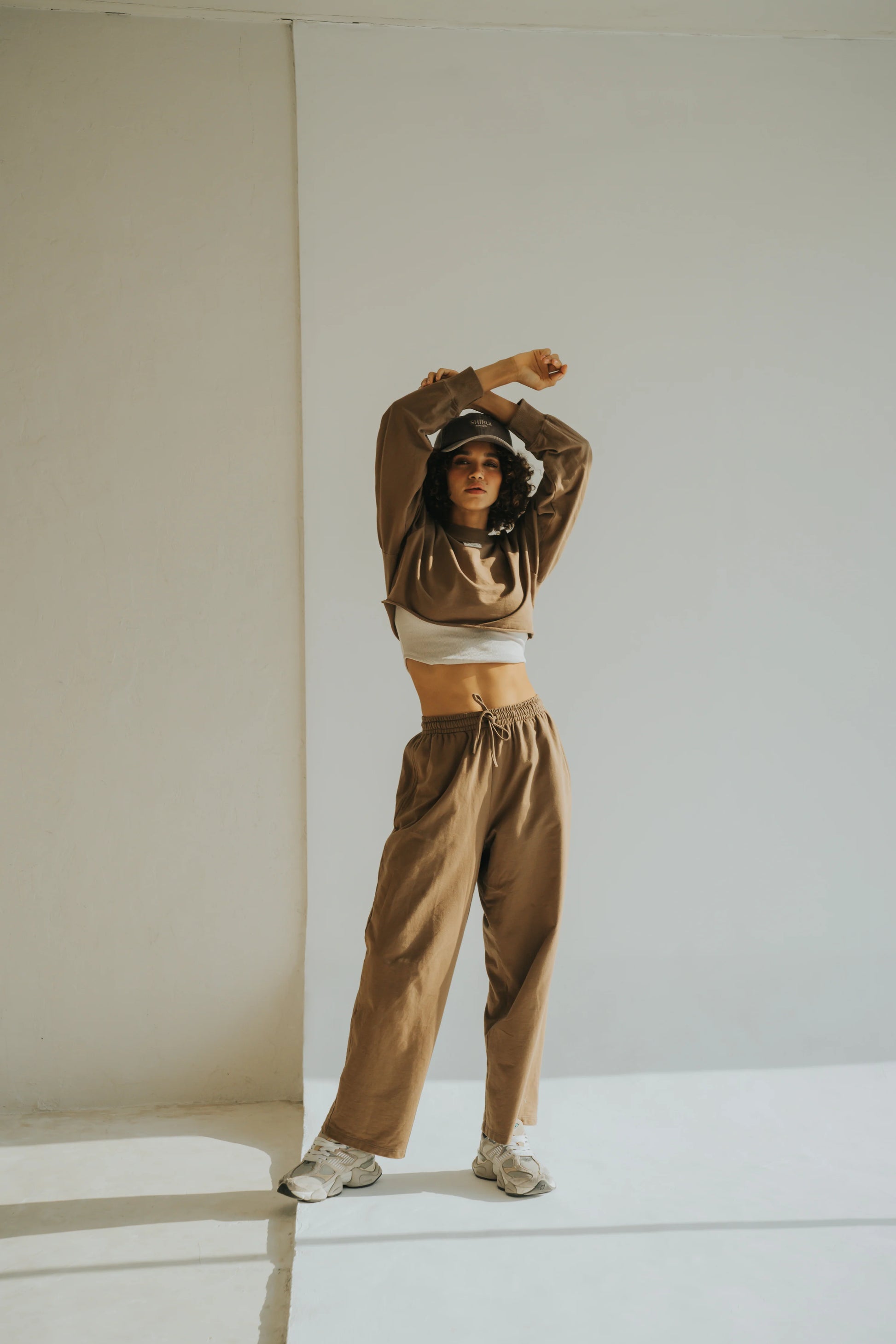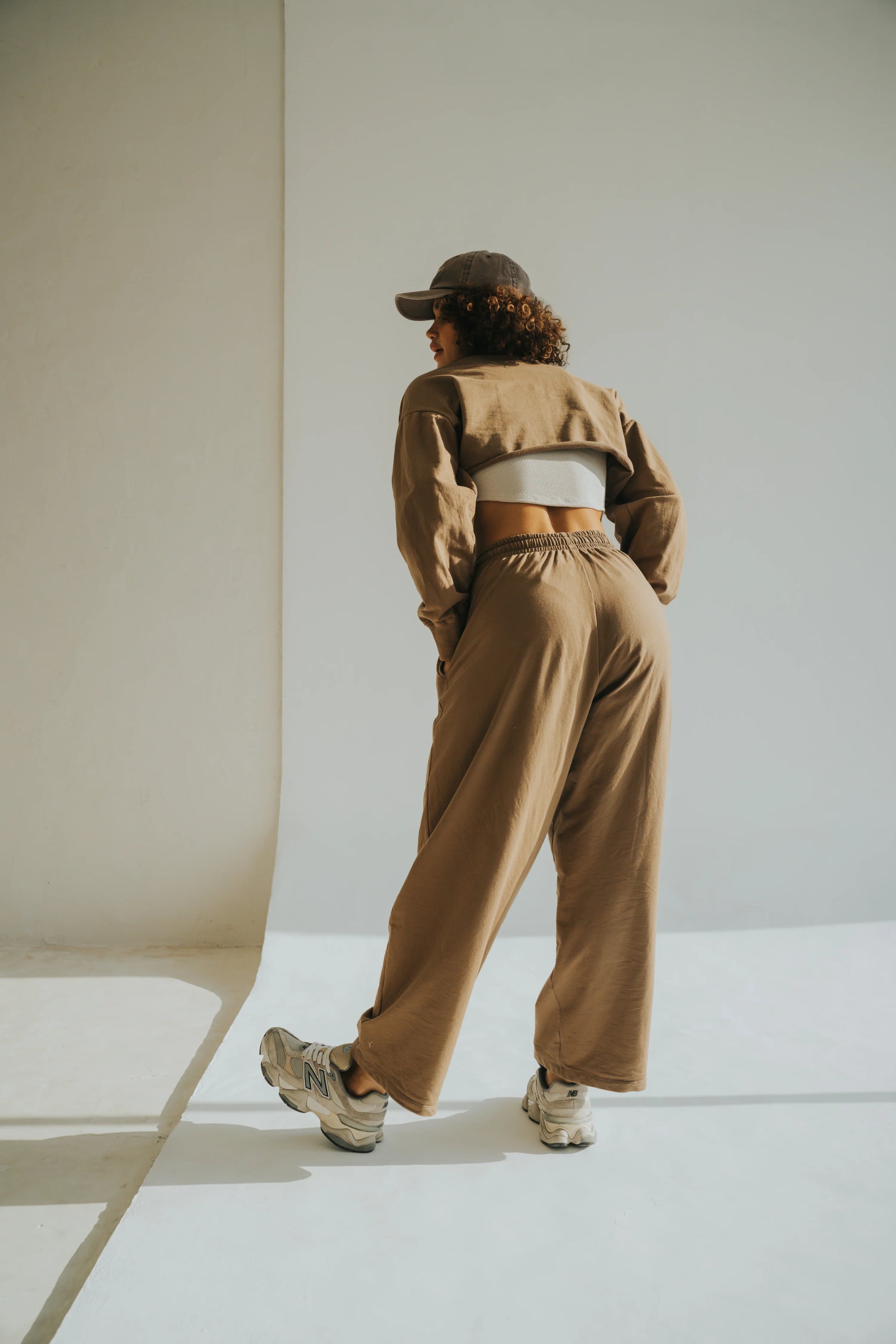 Arlo is a sophisticated, elevated Jogger with an oversized silhouette featuring a wide straight leg with side pockets and an elastic waist band.